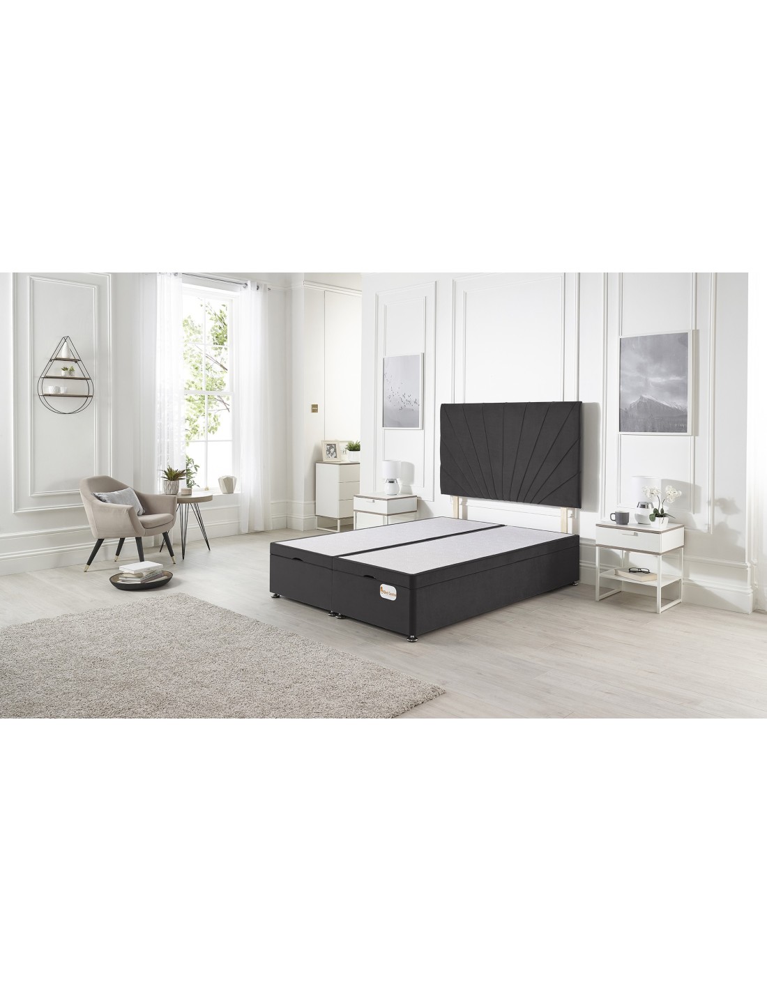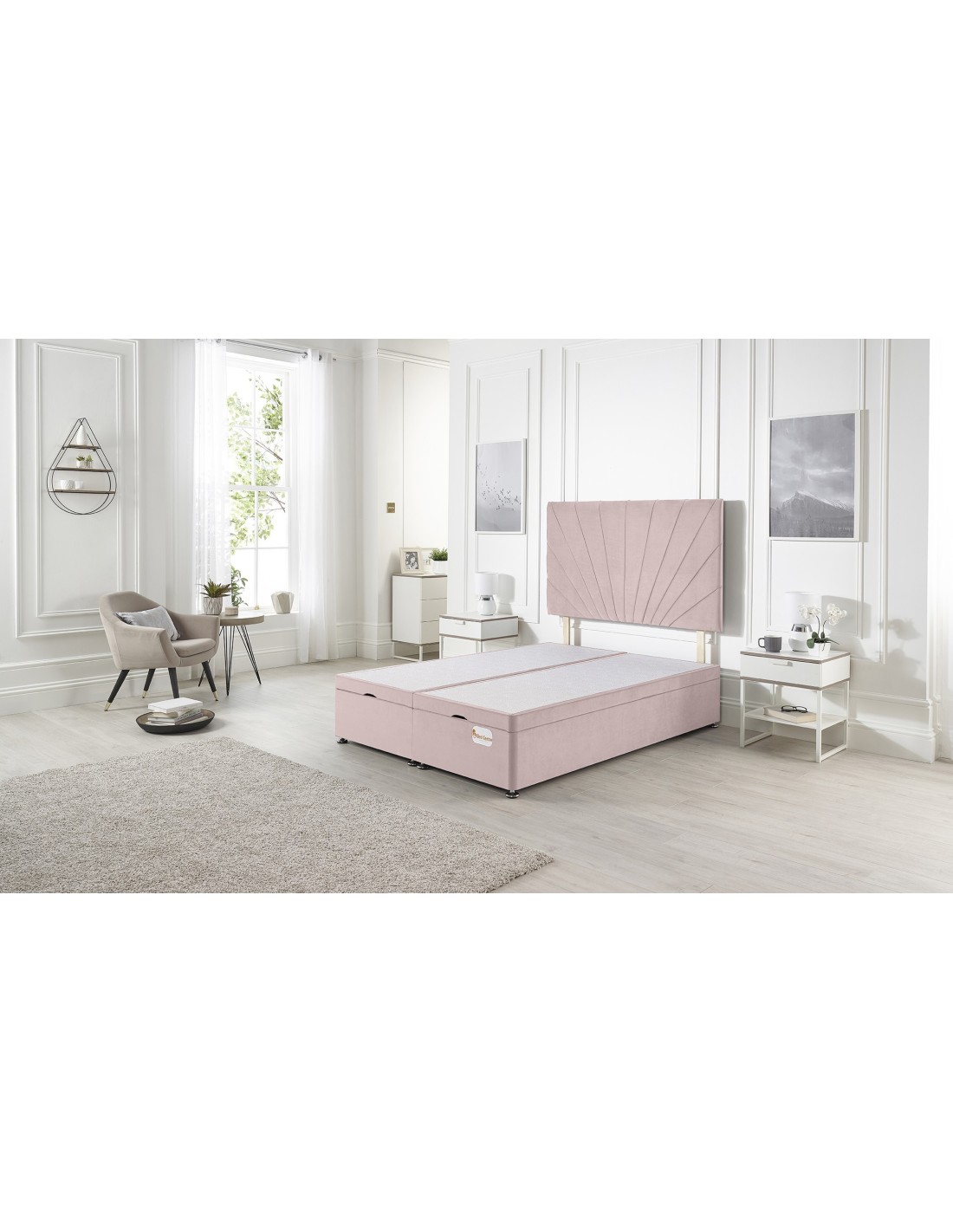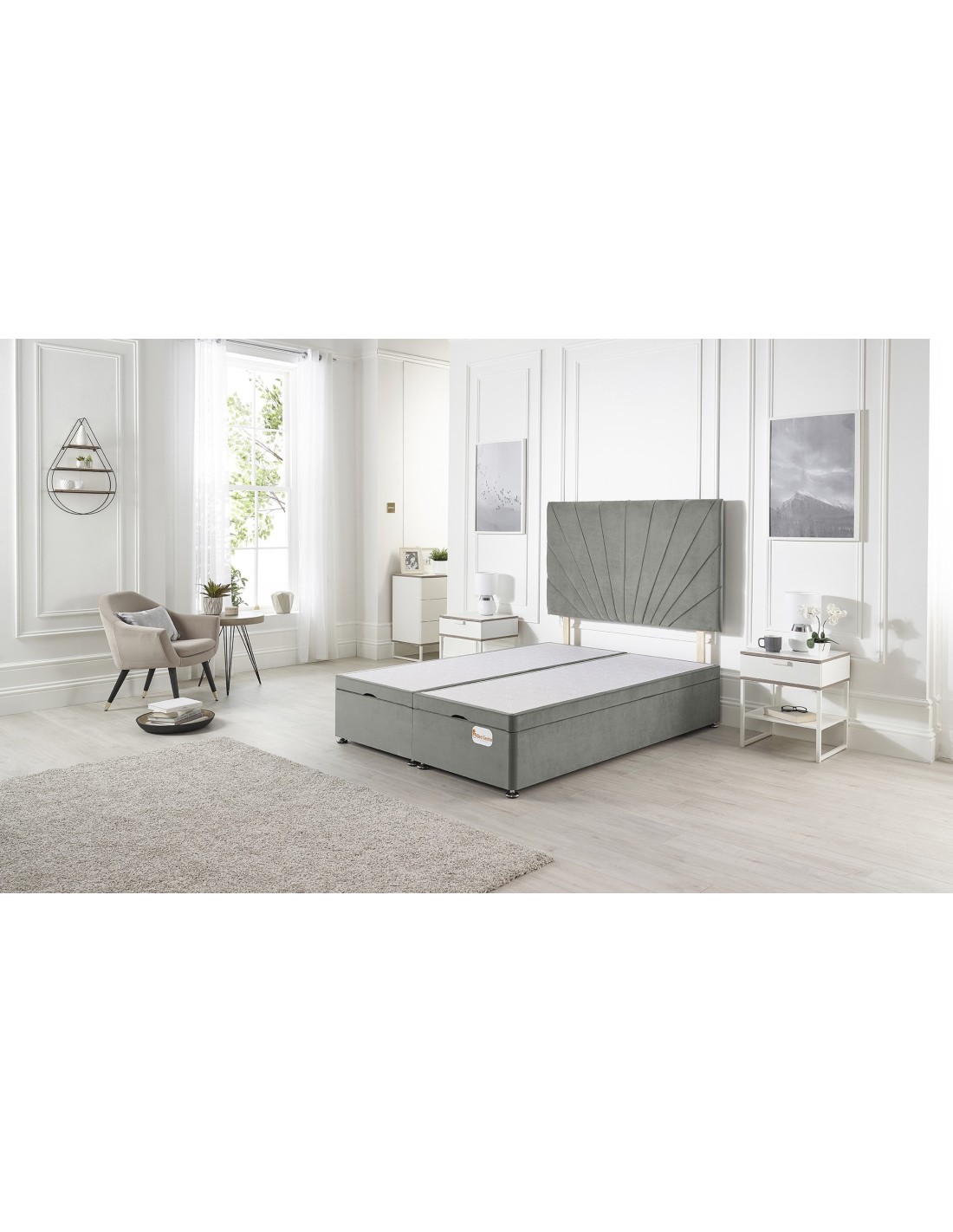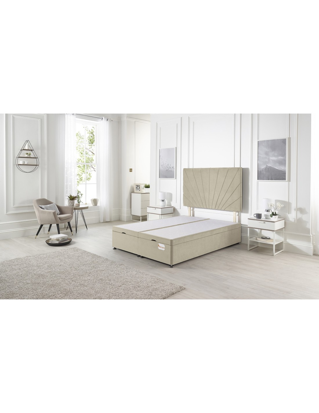 The Platinum Ottoman is one of a kind here at Next Divan and is made to offer its unique beauty as well as storage to suit your needs. The upholstery style of the Platinum Ottoman represents that of a rising sun and is sure to make your interior stand out in the crowd, with its boho look and feel. You can choose from either a foot end or side opening ottoman, to suit your room layout for easy siding.Â